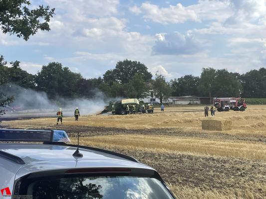 Am 05.07.2022 um 16:35 Uhr wurden alle vier Ortsfeuerwehren der Stadt Diepholz (Aschen, Diepholz, Heede und Sankt Hülfe) zu einem Ballenpressen- und Flächenbrand alarmiert. Vor Ort eingetroffen konnte schnell festgestellt werden, dass eine Fläche von 400x400 Metern brannte und auch bei der Ballenpresse offenes Feuer zu sehen war. Landwirte hatten bereits mit Grubbern eine Schneise ins Feld gezogen um eine Ausbreitung des Feuers zu verhindern. Schnell begannen die Einsatzkräfte mit der Brandbekämpfung. Der Flächenbrand konnte mit Hilfe von Wasser und Feuerpatschen sehr schnell gelöscht werden. Bei der Ballenpresse gestaltete sich dies relativ schwer, da das komplette Stroh aus der Presse entfernt werden musste. Mit schwerer Handarbeit wurde das Stroh entfernt und abgelöscht. Auch die Presse musste zwischendurch immer wieder abgelöscht werden, weil sich das Stroh in der Presse entzündete. Nach ca. 1,5 Stunden konnte Feuer aus gemeldet und mit dem Rückbau begonnen werden. Der Einsatz konnte somit nach ca. zwei Stunden beendet werden.